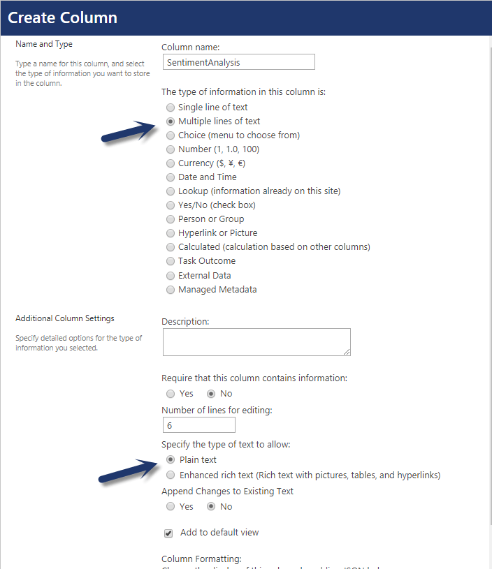 We need to create a multiple lines of text column (plain text) in configurations list with name “SentimentAnalysis”. Go to site contents –> Configurations list –> List settings –> Crow Canyon NITRO Forms –> click on “Create column” in the ribbon (see sample screenshot below)