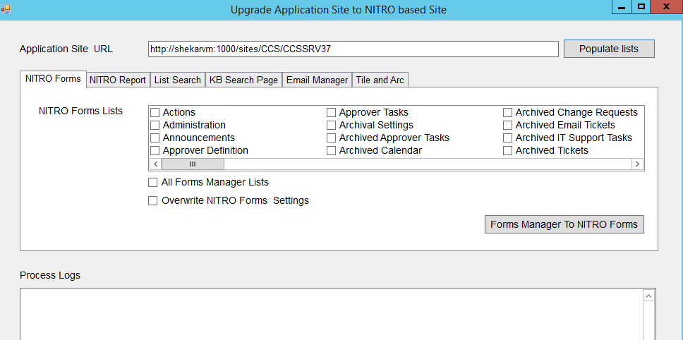 We can run the tool for selective lists if required by selecting the required individual lists or we can also select “All Forms Manager Lists” and check “Overwrite NITRO Forms Settings” option.