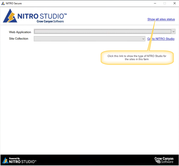 Open “Crow Canyon NITRO Studio Helper” shortcut from the desktop and click “Show all sites status” link in the NITRO Secure utility tool as shown below: