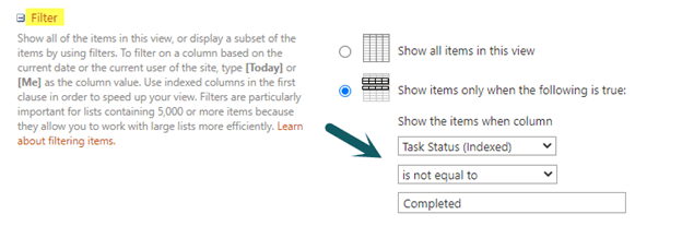 - Configure ‘My open tasks’ filtered view in tasks list as shown below: