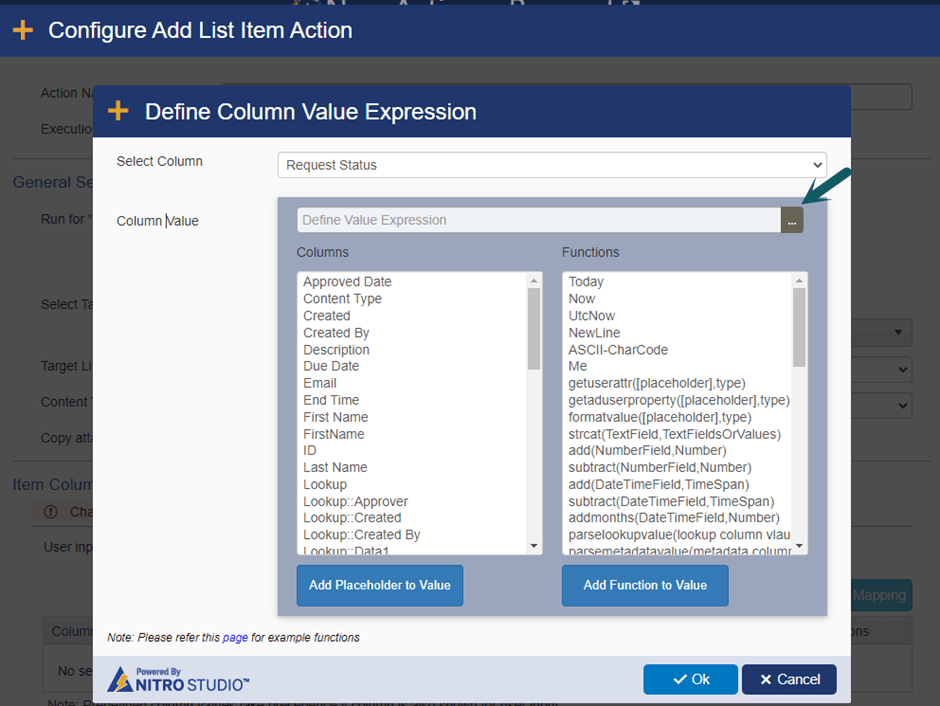To use expression builder in column mappings, go to the actions configured in custom actions/NITRO Workflows, ‘Add column mappings’ and click ellipses icon to define the expression for column value.