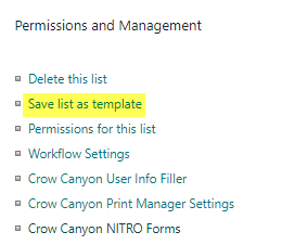 - To save ‘Tickets’ list as template, navigate to the site -> Application Administration -> Click ‘Advanced’ -> Configure Lists -> ‘Configure Tickets’. From the Tickets list settings page, under ‘Permissions and Management’ section, click ‘Save list as template’ as shown below: