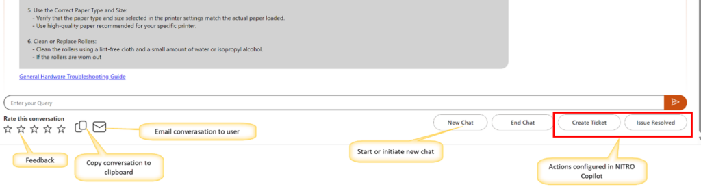 Rating: The user can rate the conversations by clicking on the stars icon available at the bottom of the chatbot.’ Rating will be stored in feedback list created by NITRO Copilot..