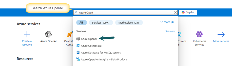 2. Open “Azure OpenAI” resource from Azure services or you can search and find out “Azure OpenAI” resource as shown below.