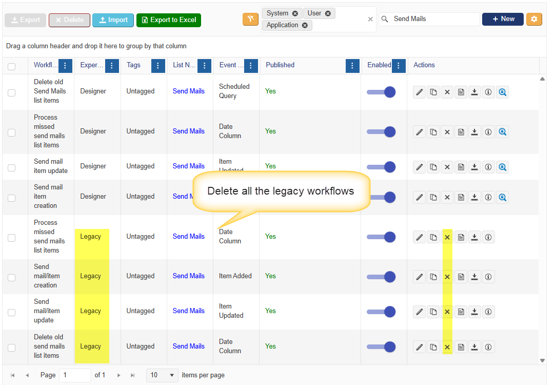 1. Check the workflows on the “Send Mails” and “CrowCanyonAppsEmails” list, delete the workflows if there are any duplicate workflows on “Send Mails” and “CrowCanyonAppsEmails” lists. Designer experience workflows are the latest and we can delete the legacy workflows as shown below.