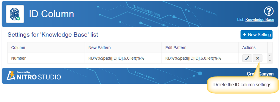 In NITRO Helpdesk application, “Knowledge Base” list is using the Crow Canyon ID column. Syntax of the ID column is as below: