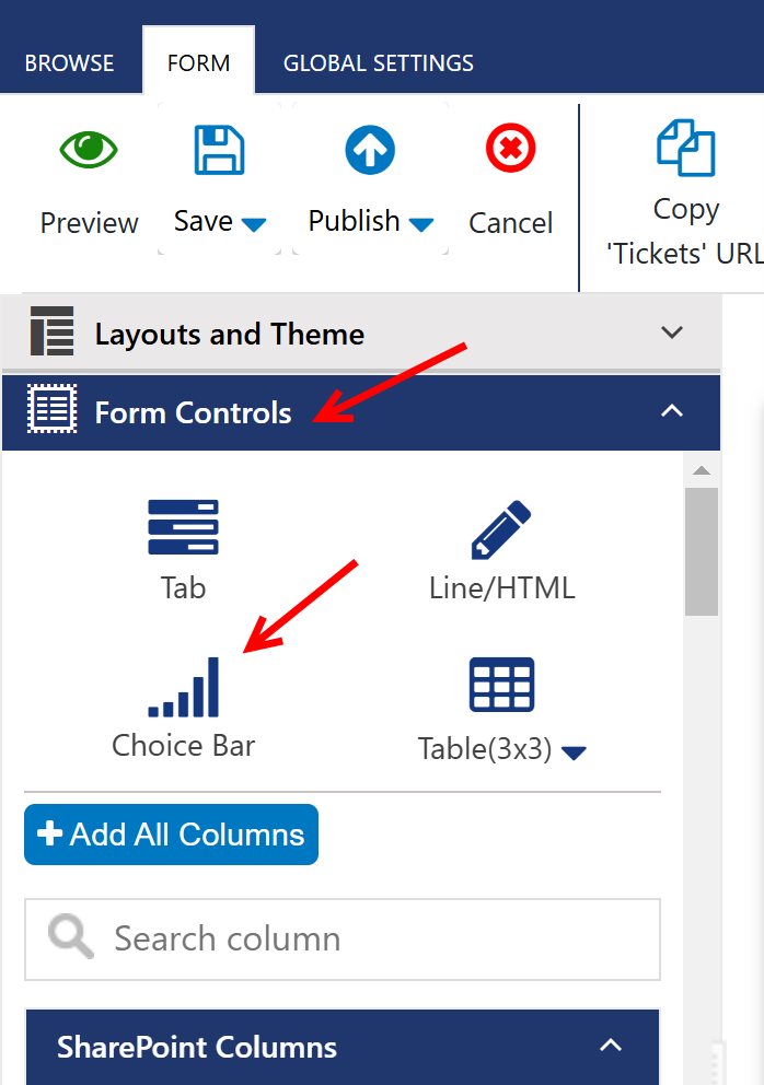 - Open NITRO Forms designer for the required list. Here it is ‘Ticket’ list. Go to the Helpdesk application -> Administration -> Configure Lists -> ‘Configure Tickets’ -> Crow Canyon NITRO Forms -> Edit the ‘Tickets’ form à Expand ‘Form Controls’ section from the left-hand panel -> Drag and drop ‘Choice Bar’ on top of the form.