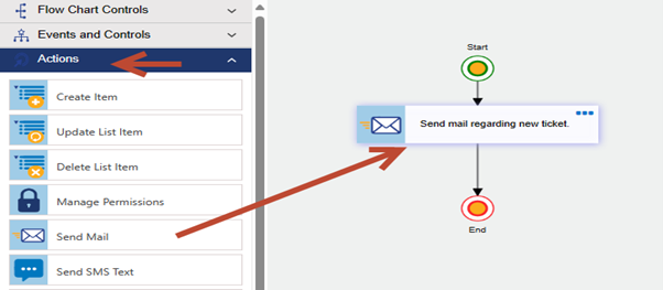 1. Navigate to the site -> Site settings -> Site Administration -> Crow Canyon NITRO Workflow -> Edit the required workflow -> Drag and drop a ‘Send Mail’ action available under ‘Actions’ section.