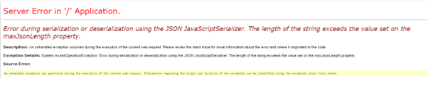 “System.InvalidOperationException: Error during serialization or deserialization using the JSON JavaScriptSerializer. The length of the string exceeds the value set on the maxJsonLength property.”