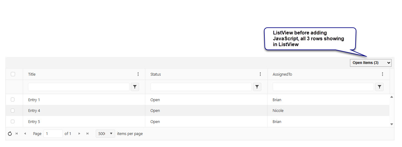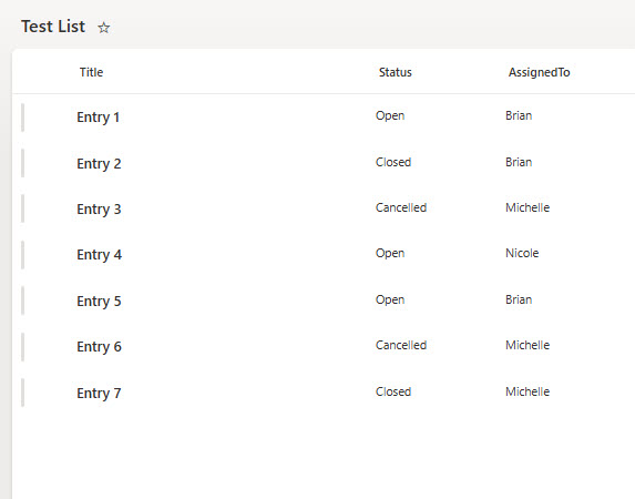 Quote from Brian on January 6, 2026, 5:54 pmHere's a simple recreation, 3 columns (Title, Status, AssignedTo), all Single line of text