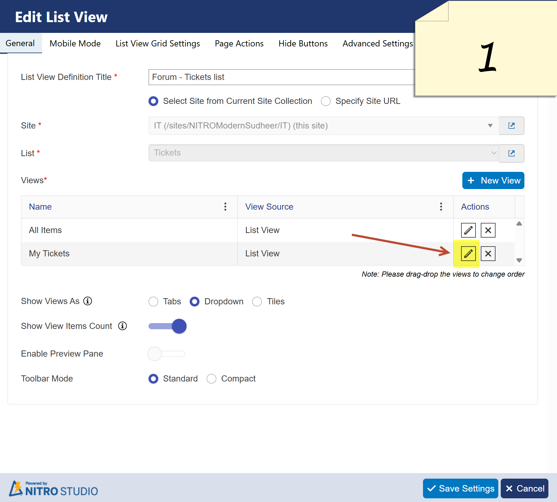 Go to NITRO List View Settings and click Edit View (as shown in Picture 1).