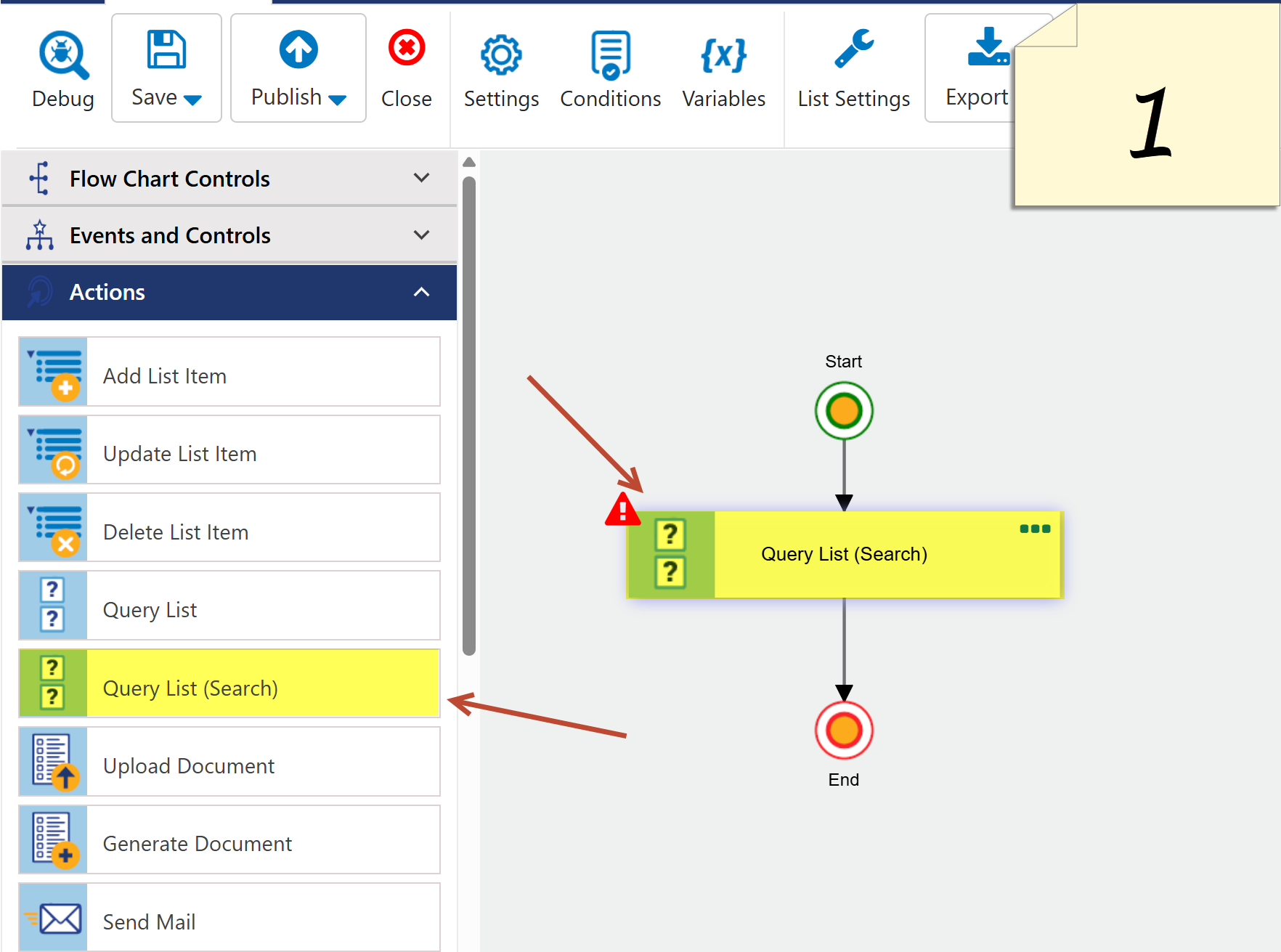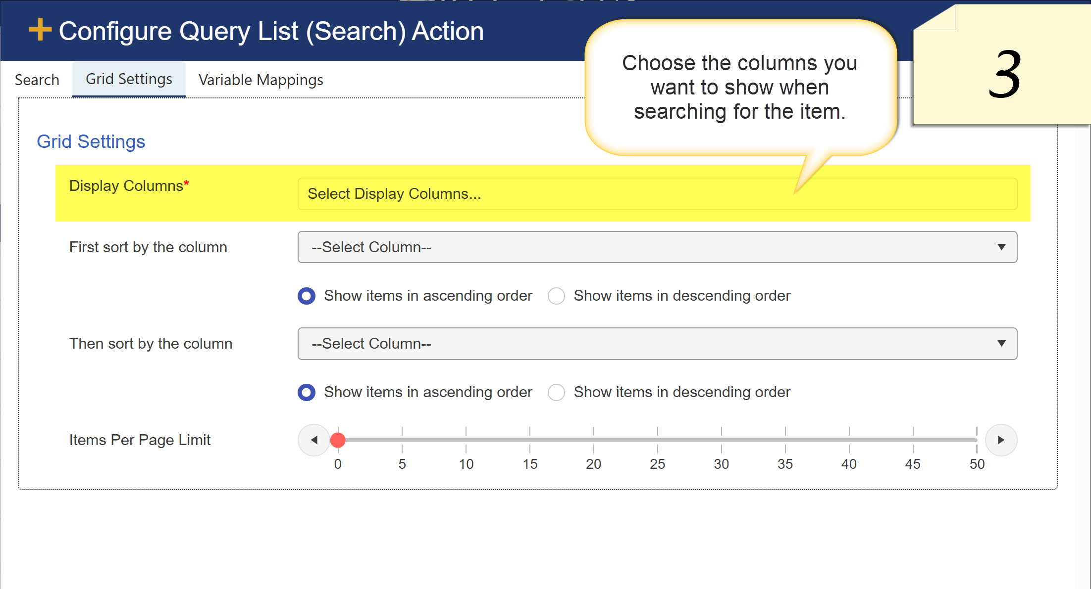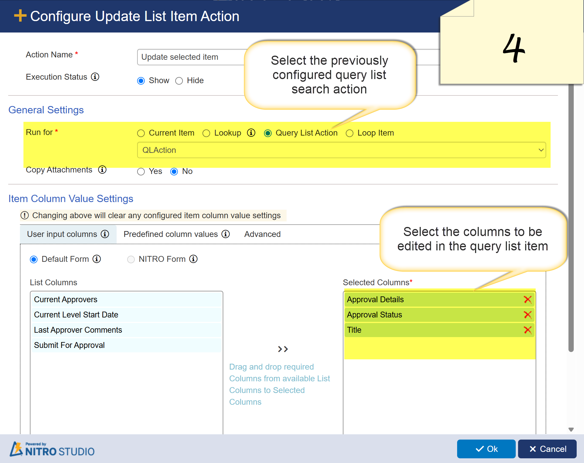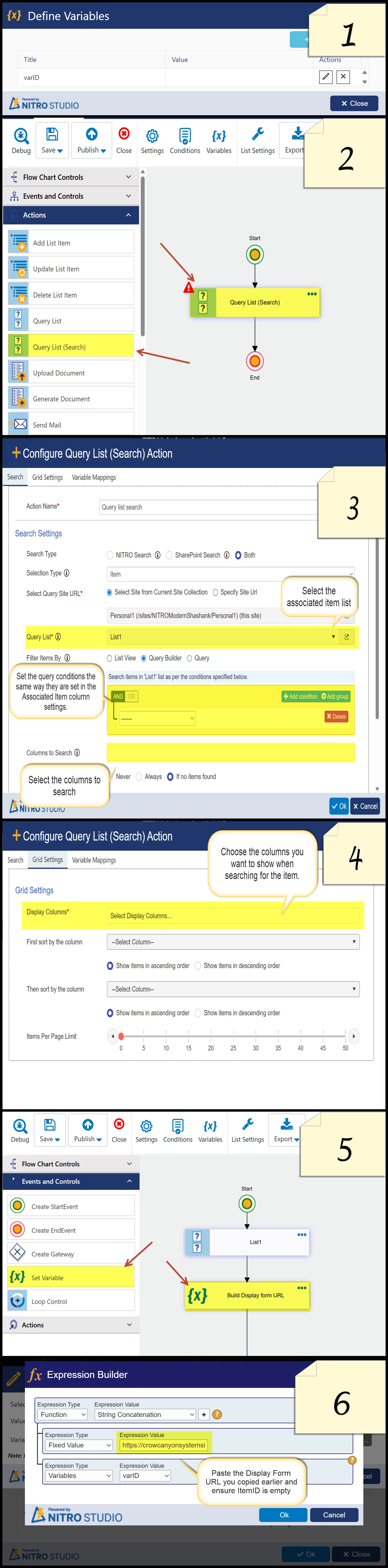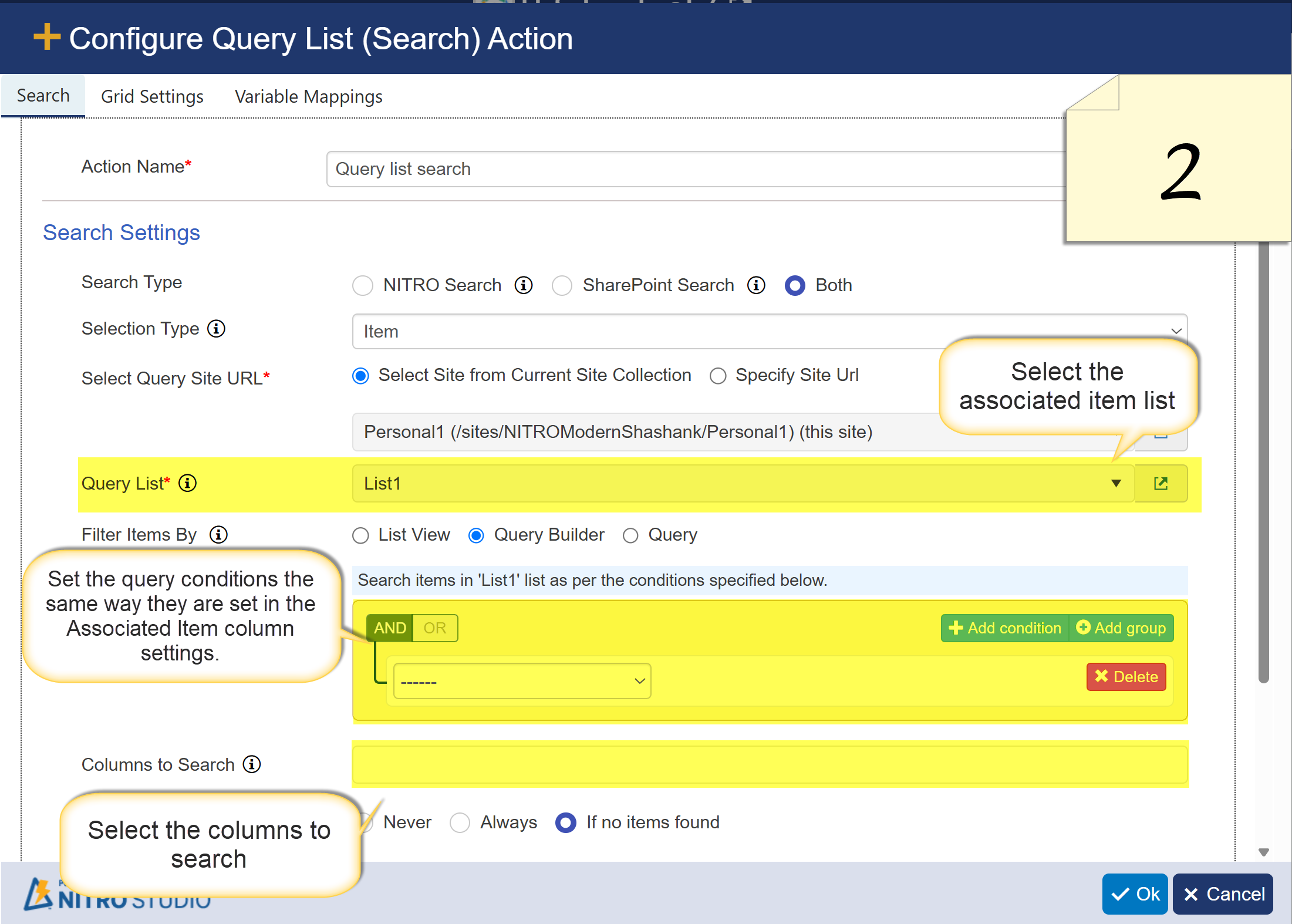 List Settings → Crow Canyon Custom Action → New → Select the list.- Drag and drop the Query List (Search) action (refer to Image 1), and configure the action settings as shown in Image 2 and 3